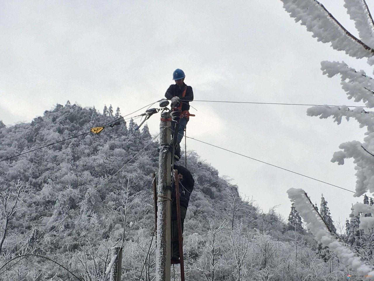 爬上冰凍的高壓電桿