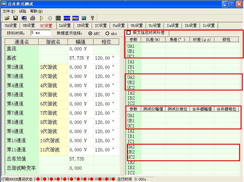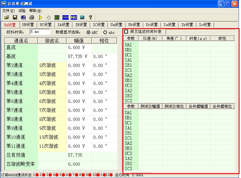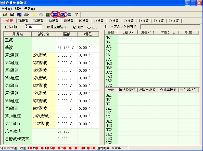 6)點擊右下角“關(guān)閉”即完成所有配置,接一組電壓信號電纜和一根數(shù)字信號光纖,設(shè)置對應(yīng)的UA、UB、UC基波電壓值(默認(rèn)57.735V)即可開始試驗,其他諧波通道可以不設(shè)置。