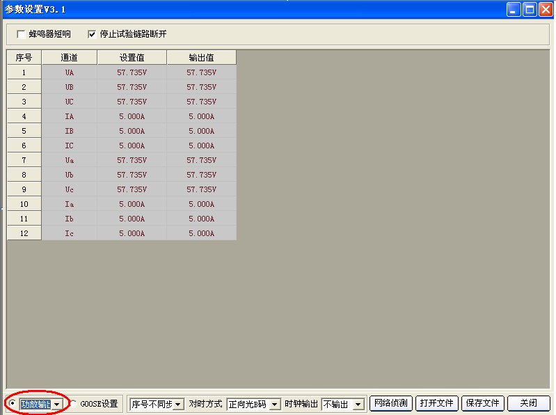 2) 點擊標(biāo)題欄中“61850”按鍵,進(jìn)入?yún)?shù)設(shè)置界面,選擇左下角“功放輸出”,表示繼保儀輸出為模擬量電流電壓信號,然后直接點擊右下角關(guān)閉即可。