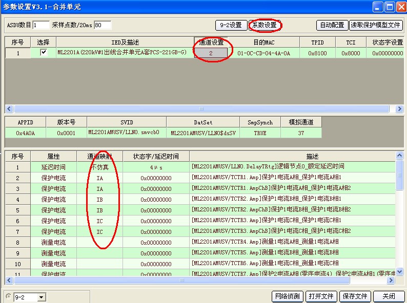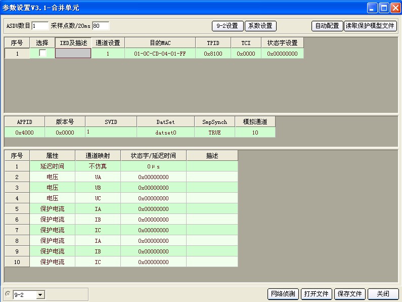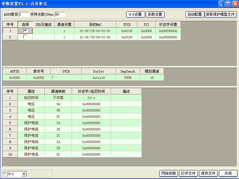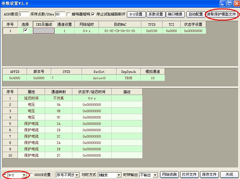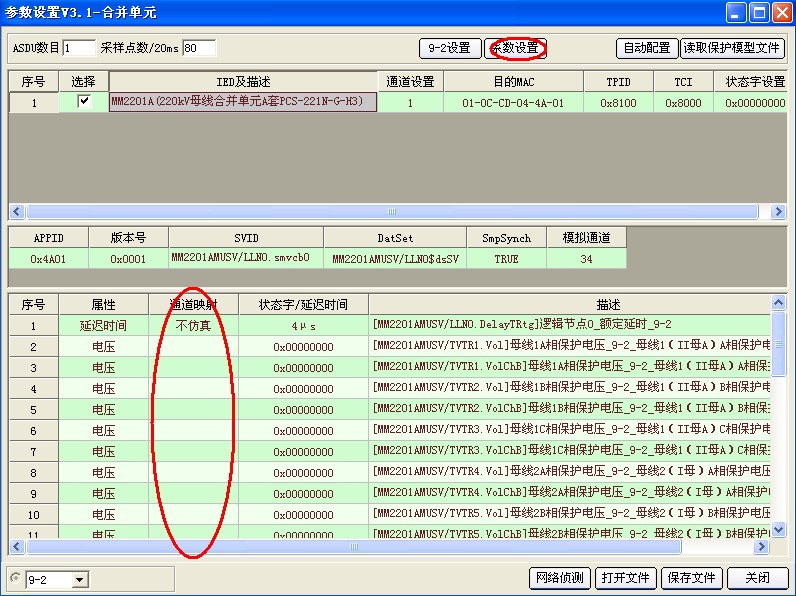 2)點擊上圖標(biāo)題欄中“61850”按鍵,進(jìn)入?yún)?shù)設(shè)置界面,選擇左下角“9-2”。
