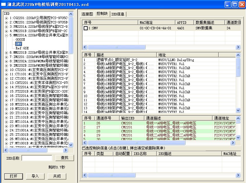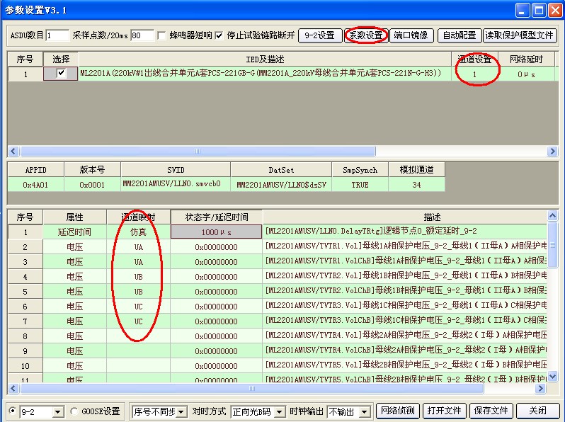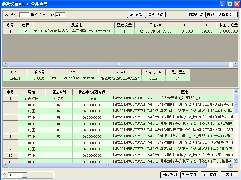 此界面需要配置母線PT合并單元輸出的數(shù)字信號配置給繼保儀,點擊上圖右上角“讀取保護(hù)模型文件”導(dǎo)入此合并單元輸出SV控制塊。