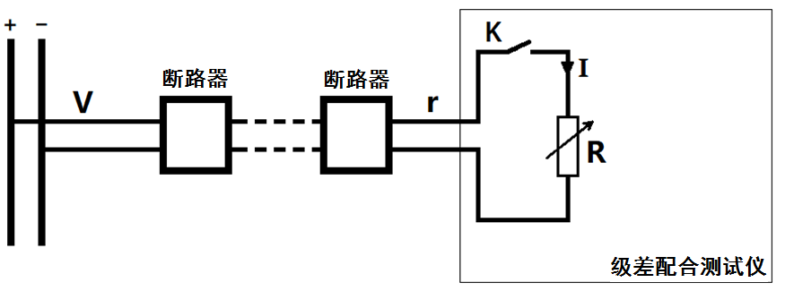 2) 設定某一測試電流Iset,裝置根據(jù)(R+r)=U/Iset計算得出所需的Rset值,調(diào)節(jié)R為Rset,閉合K,回路即可產(chǎn)生接近Iset的電流,觀察各級空開是否能正確配合跳閘。