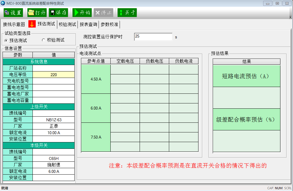 注意: 此處直流斷路器空開信息需如實正確填寫廠家、型號、規(guī)格等信息,確保直流斷路器質(zhì)量合 格。 測試儀控制系統(tǒng)將嚴格按照填寫的信息查詢斷路器脫扣曲線表,并計算出級差配合概率預估值, 這是判斷當前直流斷路器級差選擇是否合格的重要數(shù)據(jù)。