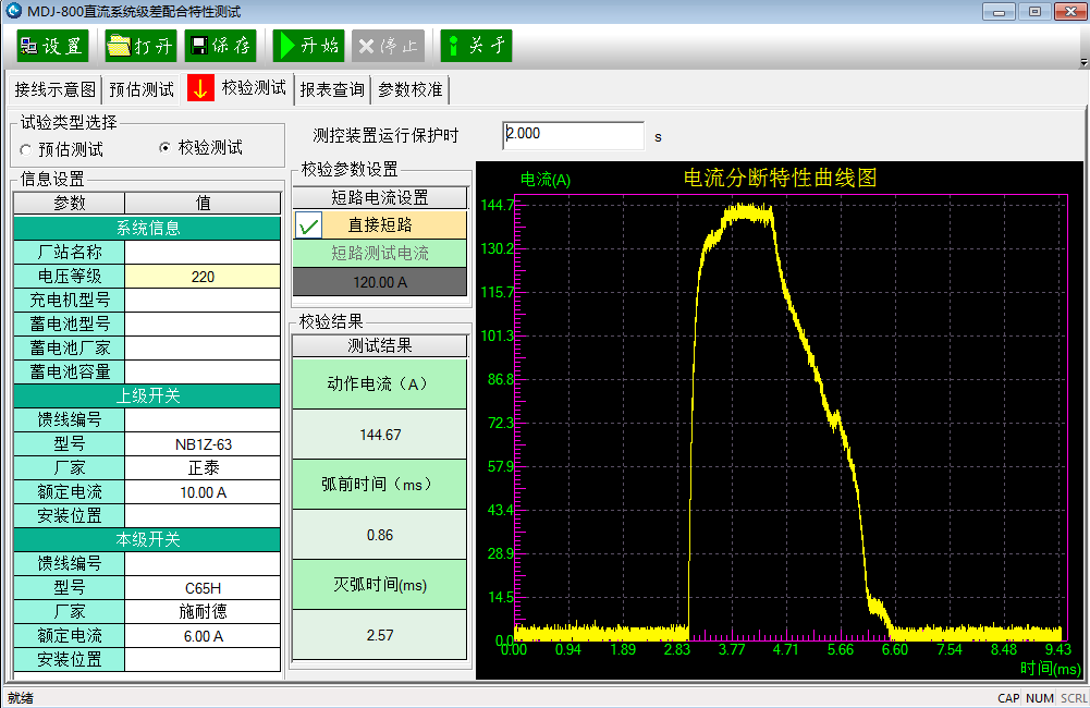 4 )校驗測試即短路測試,直接在當前直流斷路器末級進行短路測試,快速采集短路電流繪制成曲線, 計算出斷路器動作電流、弧前時間、滅弧時間,并人工觀察確定級差配合實際跳閘情況。