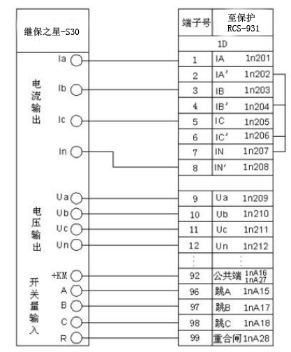 將繼保之星-S60的開入接點(diǎn)“A”、“B”、“C”、“R”分別與保護(hù)裝置的分相跳閘出口接點(diǎn)“跳A”、“跳 B”、“跳 C”以及“重合閘”接點(diǎn)相連,將繼保之星-S60的“+KM”與保護(hù)裝置的公共端相連。 此處線路對(duì)應(yīng)的開關(guān)位置在“合位”不考慮開出接線。