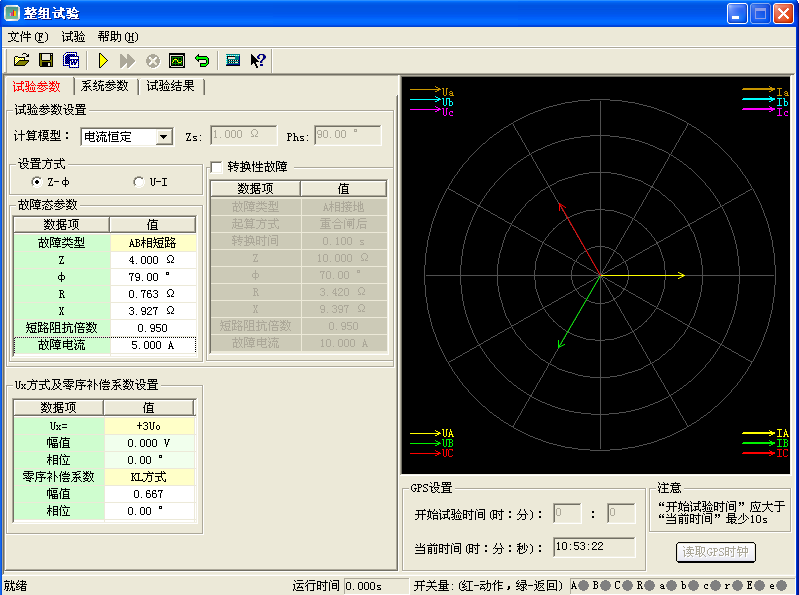 開始試驗(yàn)點(diǎn)擊右三角按鈕或者按鍵盤上的“運(yùn)行”“確認(rèn)”鍵,繼保之星-S60開始輸出,先輸出空載狀態(tài)(按鍵前一直輸出正常狀態(tài),等待保護(hù)復(fù)歸,重合閘充電完成),然后再輸出故障狀態(tài),直到保護(hù)可靠跳閘,開入接點(diǎn)A、 B、C全部閉合,接著再輸出重合閘狀態(tài),直到保護(hù)重合閘成功,開入接點(diǎn) R閉合, 最后自動(dòng)結(jié)束試驗(yàn),根據(jù)提示選擇是否保存試驗(yàn)結(jié)果。