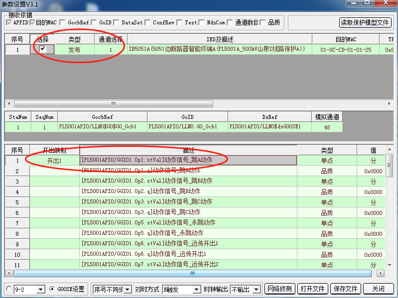 配置時需注意以下三點: ①繼保之星-6000C 模擬保護(hù)發(fā)GOOSE至智能終端,此類型應(yīng)為發(fā)布; ②通道選擇為光纖1口; ③跳閘信號為通道1映射為開出1。