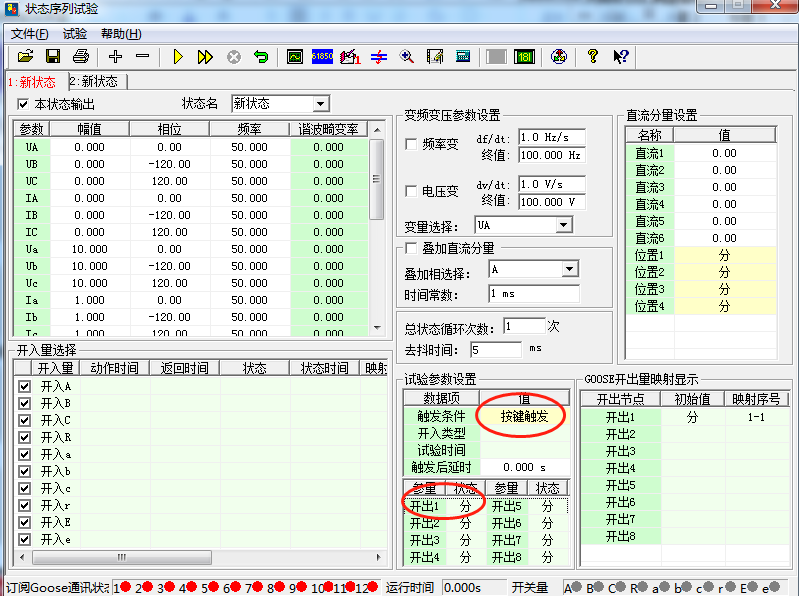 1)進(jìn)入“狀態(tài)序列”軟件主界面,設(shè)置兩個狀態(tài),狀態(tài)一設(shè)置: 開出1“分”,按鍵觸發(fā); 狀態(tài)二設(shè)置: 開出1“合”,開關(guān)量觸發(fā)。