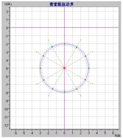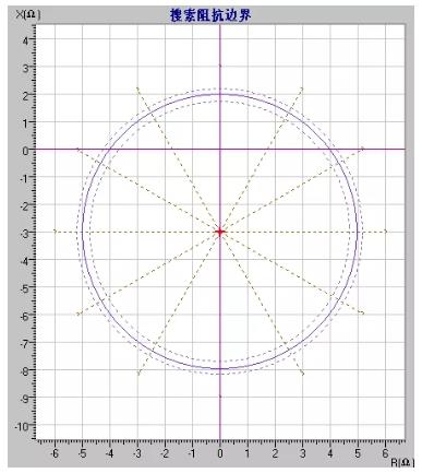 搜索中心: 根據(jù)定值可推算出中心為5Ω((8Ω+2Ω)/2=5Ω),角度為∠-90°,設(shè)置Z-Φ,軟件自動(dòng)換算出R-X。