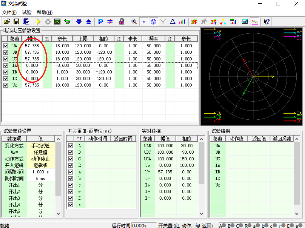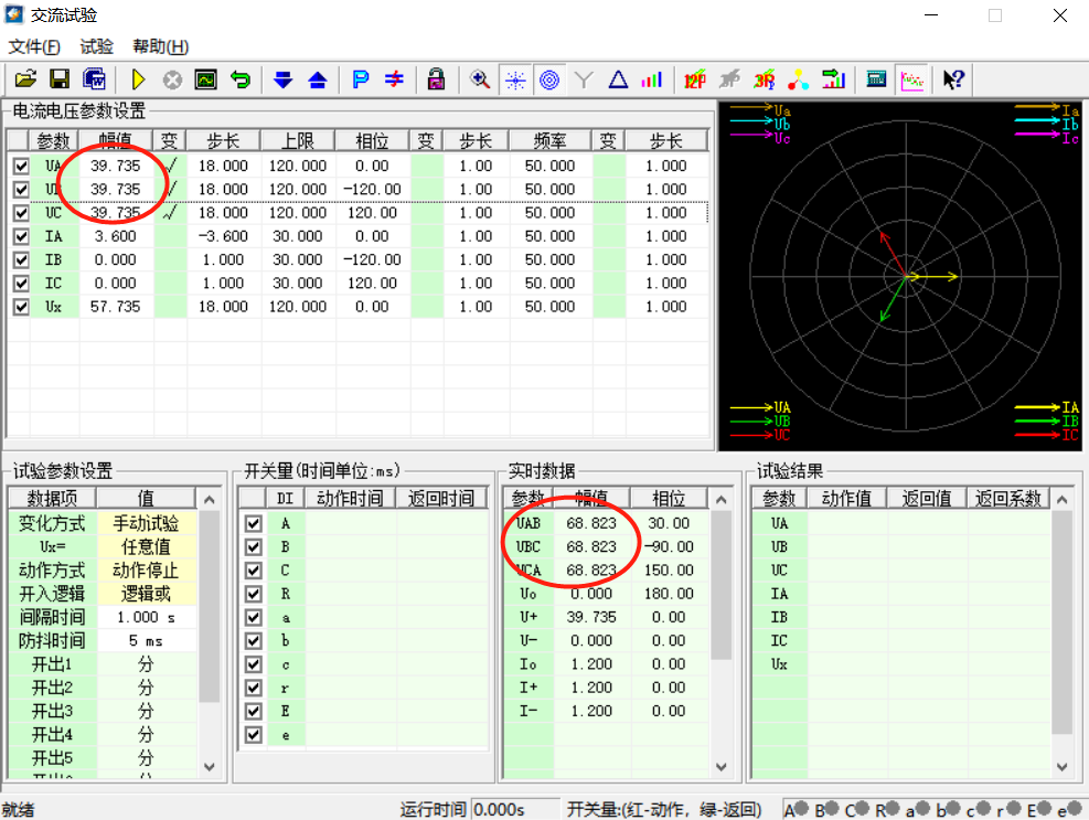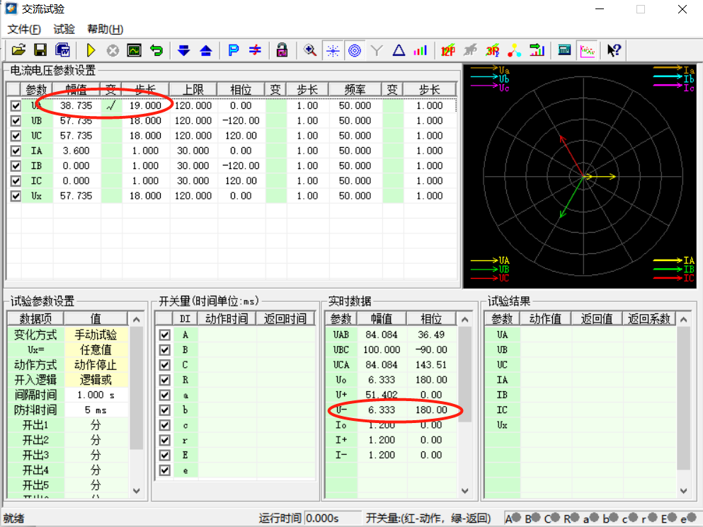 模擬A相接地故障,IA故障相角度為0°,在動作區(qū)內(nèi)點擊向下箭頭進(jìn)入故障狀態(tài)。