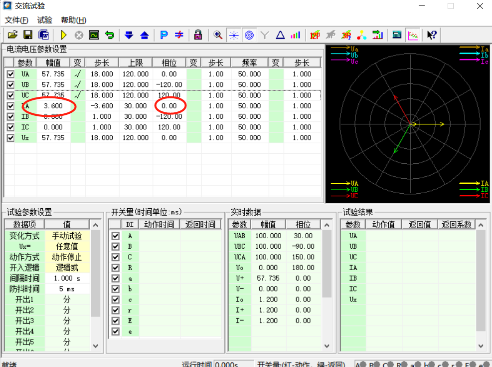 此時滿足低電壓和過流值條件,正方向保護(hù)動作,然后設(shè)置IA相電流為180°,同時驗證反方向不動。