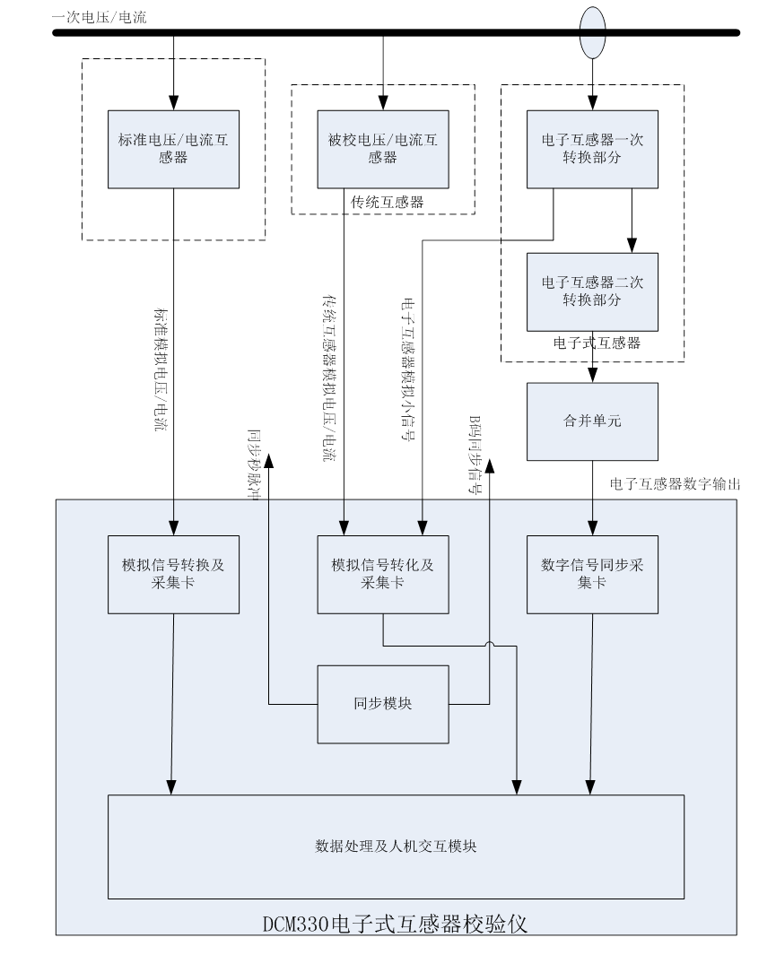 DCM-330 電子式互感器校驗儀做精度校驗時,校驗系統(tǒng)同時將標準互感器和被?;ジ衅鞯膬陕沸盘栞斎搿?mpchecktext contenteditable="false" id="1609727255535_0.25698020861969484"> 標準互感器的電壓/電流信號進入DCM330后,經(jīng)過高精度電量變換器統(tǒng)一轉(zhuǎn)換為電壓信號,然后進入高精度信號采集卡。