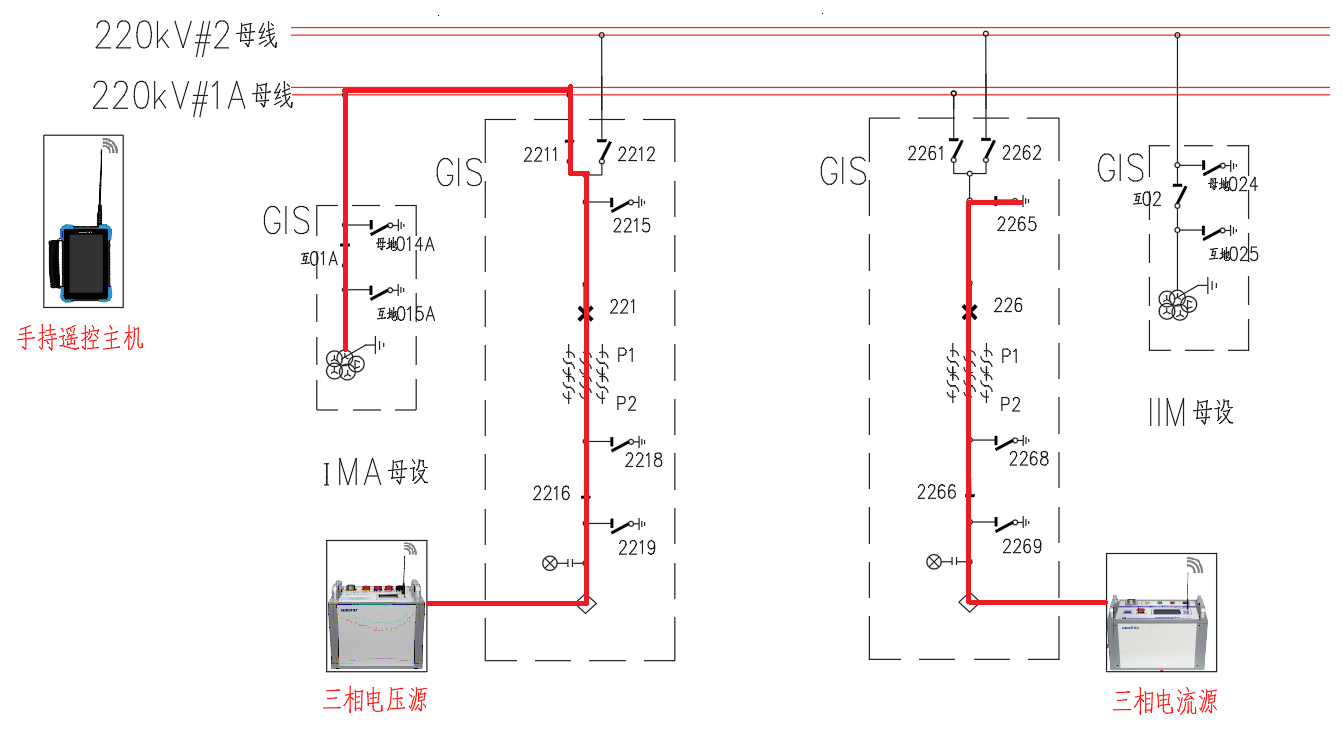 2)由于各一次設(shè)備不能在GIS內(nèi)部接線,考慮電流電壓從兩間隔的進出線引線側(cè)接入,電流選取226開關(guān)間隔,將電流從226引線處接入,經(jīng)隔刀2266流過CT再經(jīng)開關(guān)226流過,最終由地刀2265流入大地形成電流回路。 電壓選取221開關(guān)間隔,將電壓從221引線流入,經(jīng)隔刀2216、開關(guān)221、隔刀2211、隔刀互01A至IMA電壓互感器。 其他各隔刀、地刀均斷開。 三相電流、三相電壓可同時接入。