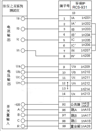 將繼保之星-S60 的電壓輸出端“Ua”、“Ub”、“Uc”、“Un”分別與保護(hù)裝置的交流電壓“Ua”、“Ub”、“Uc”、“Un”端子相連。