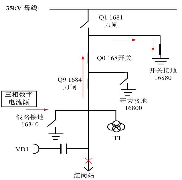 2、電流源接線: 合上隔離刀閘Q9 1684,合上Q0 168開關(guān),合上接地開關(guān)16880,斷開隔離刀閘Q1 1681,斷開接地開關(guān)16800,斷開線路接地開關(guān)16340,用HTA-3300 三相數(shù)字式智能大電流源從35kV引線接入三相電流IA、IB、IC,通過隔離刀閘1684、開關(guān)168和接地開關(guān)16880形成電流回路。