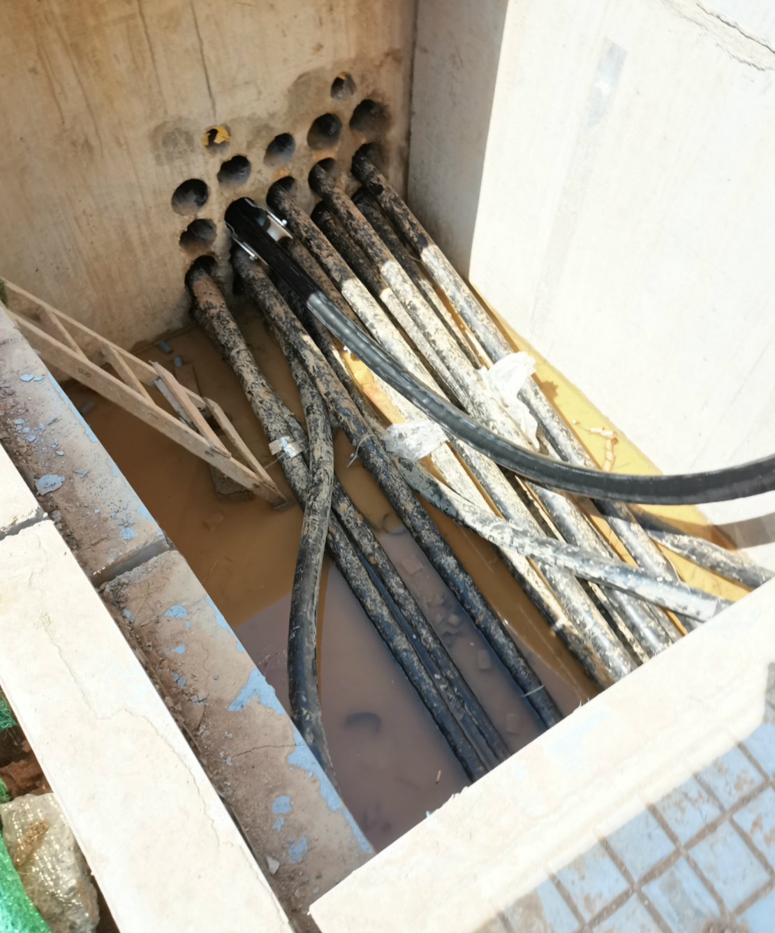 施工首日,電纜進變電站電纜夾層,只能靠人工轉(zhuǎn)運,30多名施工人員站內(nèi)站外配合轉(zhuǎn)運,兩回電纜線路同時進行鋪設(shè),克服重重困難,最終將電纜鋪設(shè)到位,并做好防水防火封堵措施,接受變電站運維人員的檢查和驗收。