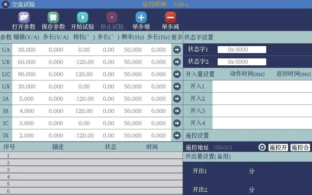 交流試驗?zāi)K是通用型、綜合性測試模塊,通過設(shè)置相應(yīng)的電壓或電流為變量,賦予變量一定的變化步長,選擇合適的試驗方式,可方便測試各種電壓電流保護的動作值、返回值,以及動作時間和返回時間等。