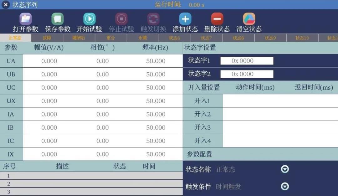 狀態(tài)序列模塊可滿足電力系統(tǒng)中一些特殊保護測試需要,如備用電源的自動投入試驗、配電系統(tǒng)保護裝置多次重合閘等。
