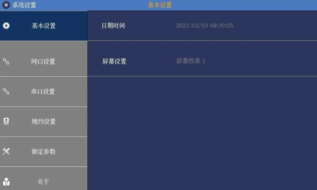 系統(tǒng)設(shè)置模塊主要針對測試儀各基本參數(shù)的設(shè)置,額定參數(shù)、與終端通訊的網(wǎng)口、串口、通訊規(guī)約等參數(shù)進(jìn)行設(shè)置。