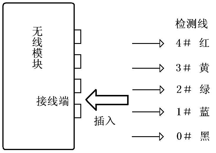 模塊側(cè)面有5個插口端,可插入5個檢測線夾,依次命名為0#端(黑)、1#端(藍)、2#端(綠)、3#端(黃)、4#端(紅)。