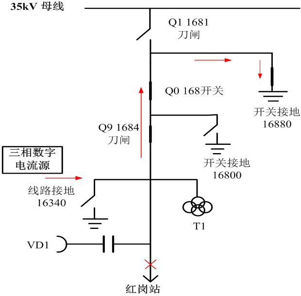 合上隔離刀閘Q9 1684,合上Q0 168開關(guān),合上接地開關(guān)16880,斷開隔離刀閘Q1 1681,斷開接地開關(guān)16800,斷開線路接地開關(guān)16340,用三臺HTA-1300 單相數(shù)字式智能大電流源從35kV引線分別接入三相電流IA、IB、IC ,通過隔離刀閘1684、開關(guān)168和接地開關(guān)16880與IN形成電流回路。