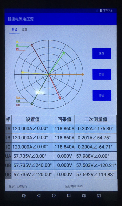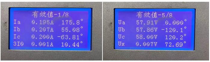 2)點擊開始試驗,電流源、電壓源啟動輸出,在YD-300 讀取相應(yīng)數(shù)值,對比保護裝置的采樣,在保護裝置查看的采樣幅值和相位與YD-300 顯示一致,由此可得,此間隔的二次回路、相序、相位、極性均正確。