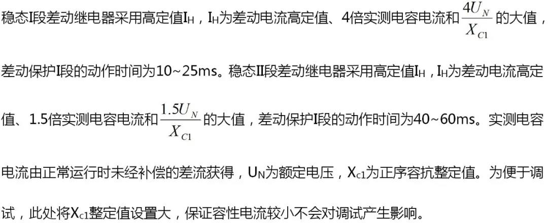 注意“六統(tǒng)一”后線路保護定值單中已沒有明確的高定值與低定值區(qū)分,只有一個差動保護定值,從保護動作時間上同樣可以區(qū)分出縱差I(lǐng)段和II段的動作,PCS-931的高定值默認為差動整定值的1.5倍。 在實際調(diào)試過程中還需要考慮4倍容性電流和1.5倍容性電流對試驗的影響,不可完全忽略。