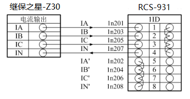 將繼保之星-Z30 電流輸出端“Ia”、“Ib”、“Ic”分別與保護裝置的交流電流“IA”、“IB”、“IC”(極性端)端子相連; 再將保護裝置的交流電流“IA'”、“IB'”、“IC'”、“IN'”(非極性端)端子短接,將“IN”(零序電流極性端)端子接回繼保之星-Z30 電流輸出端“In”。 將繼保之星-Z30開入接點“A”與保護裝置的分相跳閘出口接點“跳A”接點相連,將繼保之星-Z30 “+KM”與保護裝置的公共端相連。
