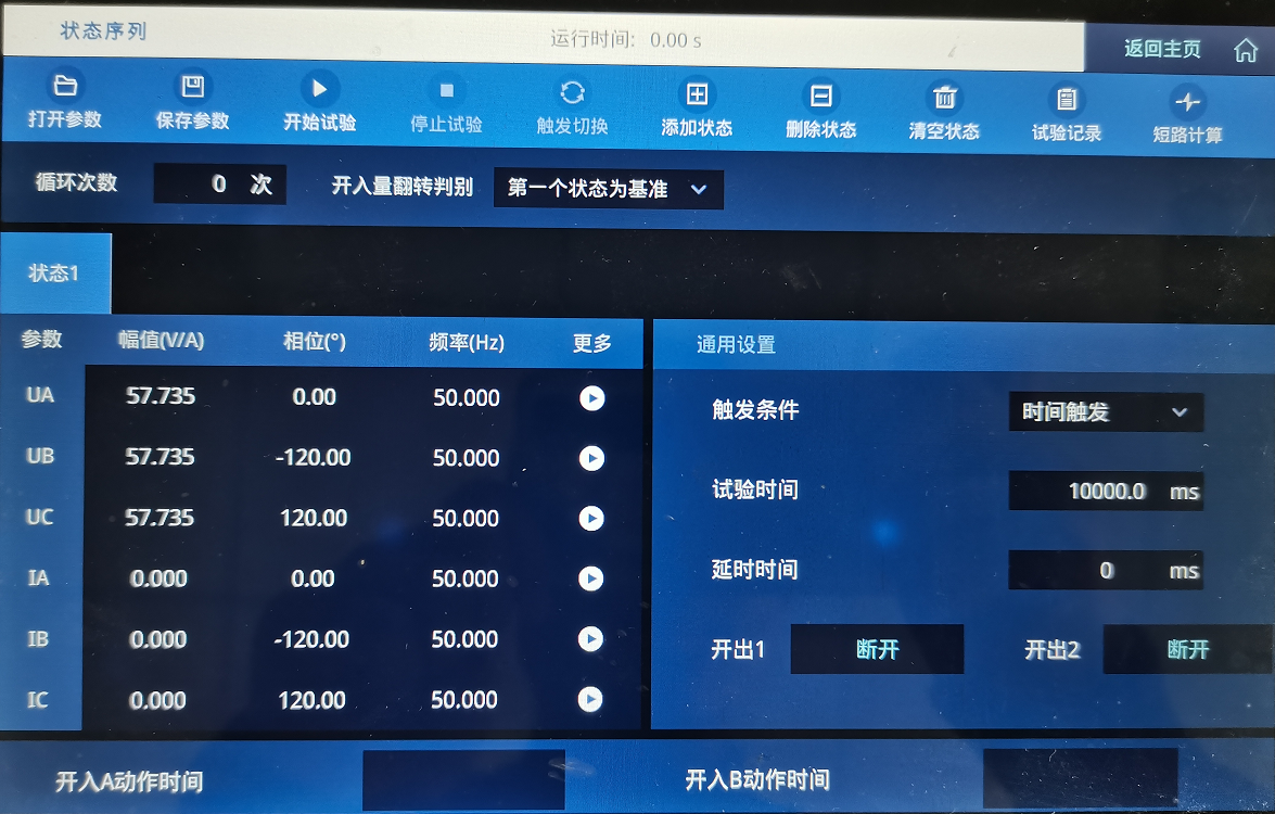 ②加量,設(shè)置完成后,點擊運行。 ?繼保之星-Z30按照正常態(tài)設(shè)定值輸出持續(xù)時間10s,10s后裝置自動切換至下一狀態(tài),繼保之星-Z30 按照故障態(tài)設(shè)定值輸出持續(xù)時間40ms。