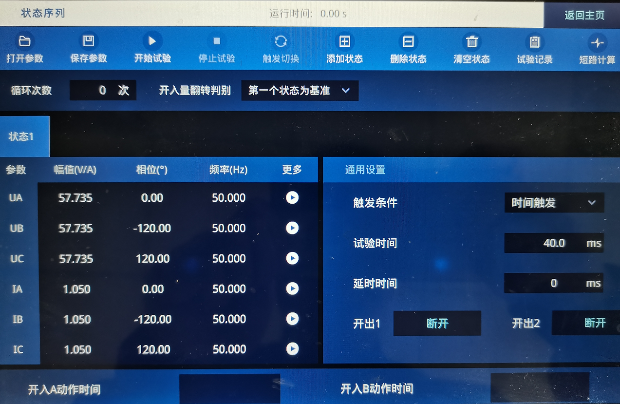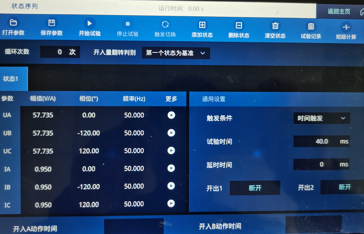 狀態(tài)二設(shè)置見下圖。 UA=UB=UC=57.734V,IA=IB=IC=1.05A,電壓電流均為正序,觸發(fā)方式: 時間觸發(fā)40ms。
