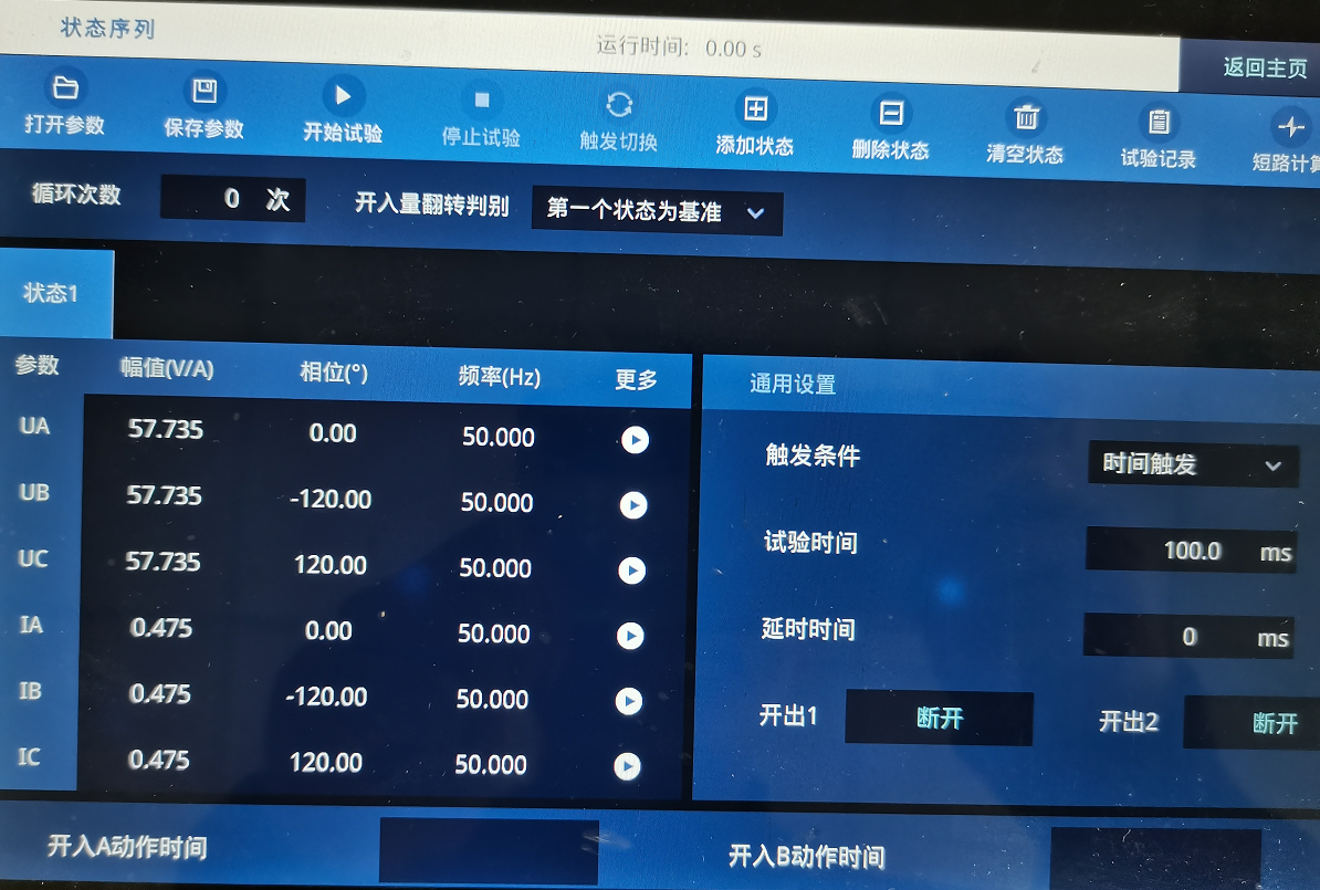 狀態(tài)二設(shè)置見下圖。 UA=UB=UC=57.734V,IA=IB=IC=0.475A,電壓電流均為正序,觸發(fā)方式: 時間觸發(fā)100ms。