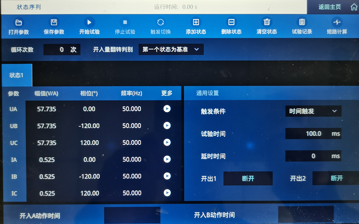 狀態(tài)二設(shè)置見下圖。 UA=UB=UC=57.734V,IA=IB=IC=0.525A,電壓電流均為正序,觸發(fā)方式: 時間觸發(fā)100ms。