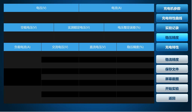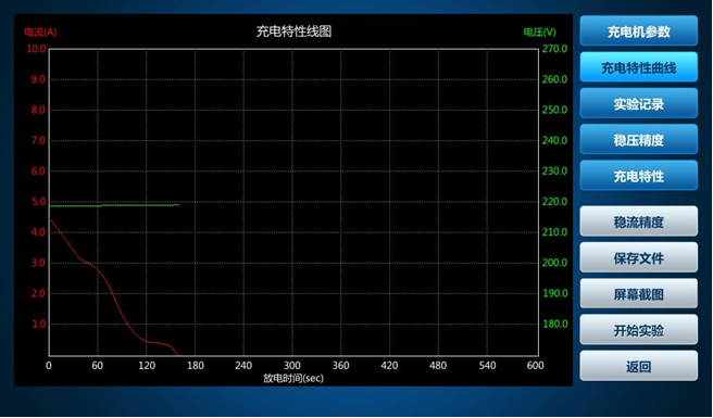 3)充電機(jī)特性試驗(yàn): 設(shè)置充電參數(shù)時(shí)若要使用調(diào)壓器則勾選,選擇對應(yīng)的穩(wěn)壓精度、充電特性、穩(wěn)流精度進(jìn)行試驗(yàn)。