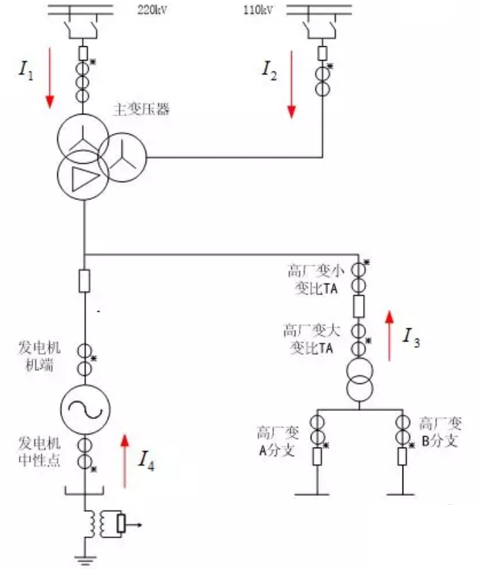 某 電 廠發(fā)變組系統(tǒng)見下圖,主變?yōu)槿ψ?,廠變低壓側(cè)為雙分支,發(fā)變組差動包含四個支路電流,分別為主變220kV側(cè)I1,110kV側(cè)I2,高廠變高壓側(cè)I3,發(fā)電機中性點側(cè)I4。