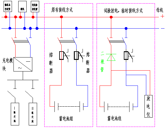 圖中試驗(yàn)放電、臨時(shí)接線方式中取下蓄電池正極熔斷器,利用大功率二極管正負(fù)極取代蓄電池正極熔斷器位置(二極管正極接熔斷器下端,負(fù)極接熔斷器上端,注意極性不能接反),蓄電池組總正負(fù)極連接FDT-220/110 直流系統(tǒng)綜合測(cè)試儀。 電池組放電過程中,由于二極管的單向逆止作用,直流屏上的充電模塊不能對(duì)蓄電池組進(jìn)行充電。 試驗(yàn)過程中,若是出現(xiàn)直流屏輸入交流電源斷電或是高頻充電模塊故障,試驗(yàn)中的蓄電池仍可以向直流饋線屏供電,避免充放電試驗(yàn)過程中直流電源失壓。