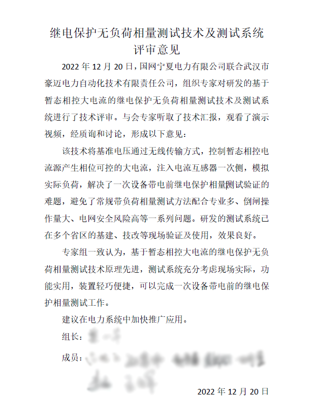 2022年12月20日,國(guó)網(wǎng)寧夏電力有限公司聯(lián)合武漢市豪邁電力自動(dòng)化技術(shù)有限責(zé)任公司組織專家對(duì)研發(fā)的基于暫態(tài)相控大電流的繼電保護(hù)無負(fù)荷相量測(cè)試技術(shù)及測(cè)試系統(tǒng)進(jìn)行了技術(shù)評(píng)審。