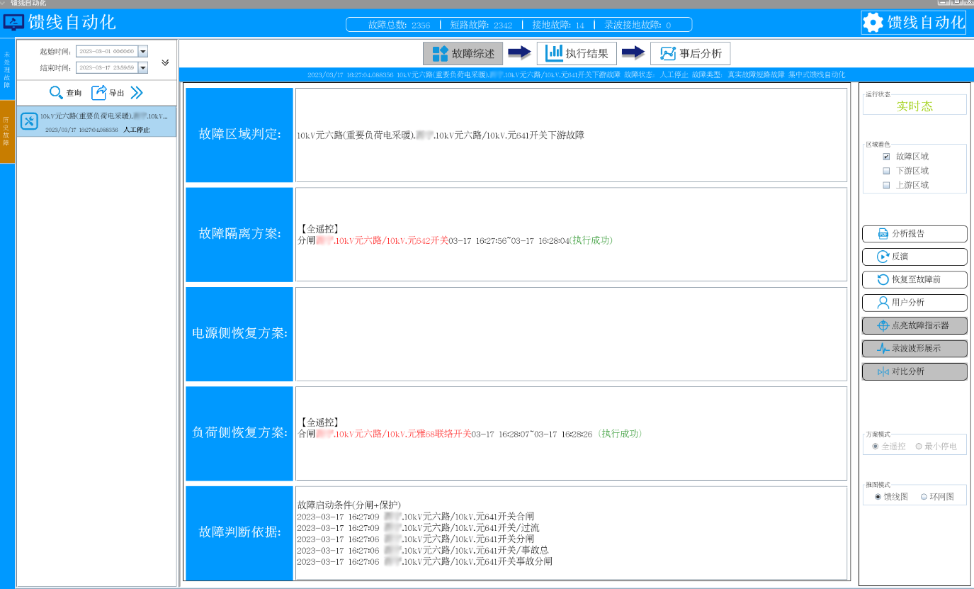 6)主站廠家、局方、武漢豪邁測試工程師通過告警窗核查主站系統(tǒng)采集故障信號是否完整并及時(shí),故障分析后彈出的故障隔離策略是否正確。
