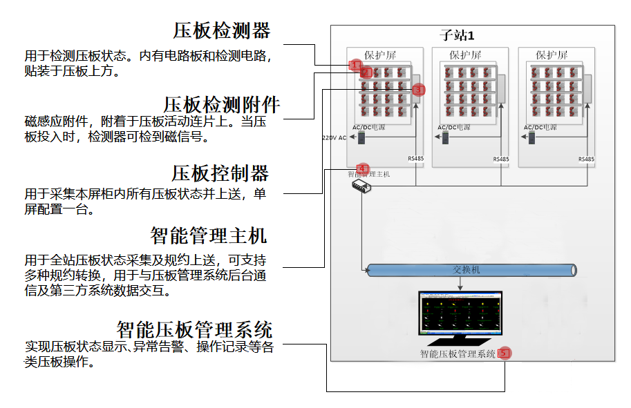 方案實(shí)施 從保護(hù)室的UPS不間斷電源屏取一路電源為整個(gè)系統(tǒng)供電,每面含壓板的保護(hù)屏、測(cè)控屏等屏柜,10kV高壓室前面板含有壓板的開關(guān)柜加裝智能壓板檢測(cè)器與智能壓板控制器。 智能壓板檢測(cè)器可采集本屏單排壓板狀態(tài),通過專用線纜連接將壓板狀態(tài)上傳至本屏智能壓板控制器。 含壓板的每個(gè)屏柜安裝一個(gè)控制器,控制器使用DC 12V電源(通過電源模塊將AC 220V轉(zhuǎn)換為DC 12V),每10個(gè)控制器配備一個(gè)空開與一個(gè)電源模塊,安裝于首屏的屏柜后導(dǎo)軌處,控制器間通過電纜串接供電。 保護(hù)室增加一臺(tái)智能管理主機(jī),對(duì)區(qū)域內(nèi)所有智能壓板控制器進(jìn)行數(shù)據(jù)匯總,處理后通過交換機(jī)將采集的壓板信號(hào)統(tǒng)一上傳至壓板在線監(jiān)測(cè)系統(tǒng)進(jìn)行統(tǒng)一管理及顯示。