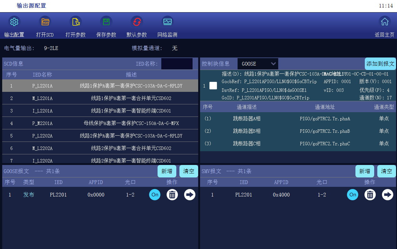 ①解析SCD文件: 61850打開SCD文件,找到保護(hù)裝置IED名稱,也可通過搜索IED名稱更快定位。 右邊控制塊信息顯示所選IED的GOOSE及SV信息,左下角顯示所導(dǎo)入的GOOSE,右下角顯示所導(dǎo)入的SV。