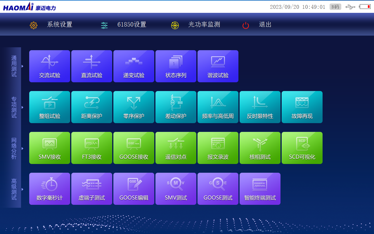 繼保之星-Z70 軟件主界面主要包括通用測(cè)試、專項(xiàng)測(cè)試、網(wǎng)絡(luò)分析和高級(jí)測(cè)試四大測(cè)試模塊。