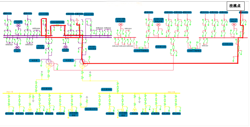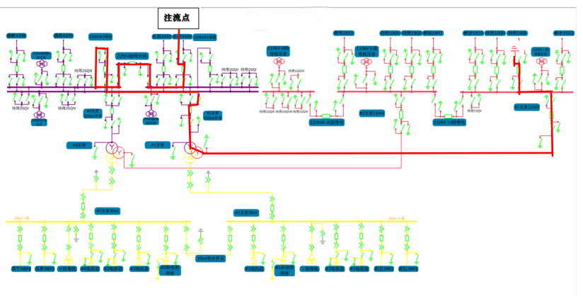 本方式使用電壓法通過220kV側(cè)長橋44A6間隔、220kV副母Ⅰ、220kV副母分段、220kV副母Ⅱ、220kV #2母聯(lián)、220kV正母、及1號主變高、中壓側(cè)向110kV母線注流,并通過出線待用1GQⅠ間隔線路側(cè)接地刀閘接地形成回路。 試驗電流依次通過220kV側(cè)長橋44A6間隔、220kV副母Ⅰ、220kV副母分段、220kV副母Ⅱ、220kV #2母聯(lián)、220kV正母、1號主變高、中壓側(cè)、110kV Ⅰ母線、待用1GQⅠ間隔接地。