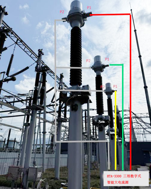 HTA-3300?三相數(shù)字式智能大電流源一次試驗(yàn)線應(yīng)可靠連接分段224開(kāi)關(guān)CT一次側(cè)極性端P1,一次通流經(jīng)過(guò)CT后從P2流出,形成“P1—CT—P2”可靠回路(見(jiàn)下圖)。