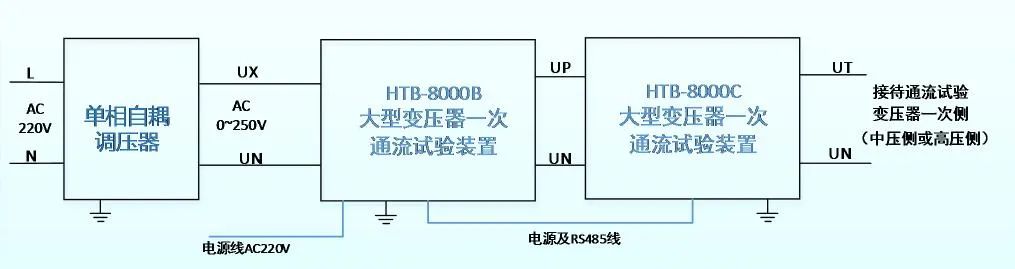 通流試驗接線: 將單相調(diào)壓器、HTB-8000B、HTB-8000C串接為A相輸出接線,B/C兩相同理,3臺單相自耦調(diào)壓器工作電源為AC380V(空開不小于16A),三相分別使用A/B/C的火線,零線共用(保證輸出120°相角差)。 HTB-8000B接入工作電源AC220V(10A),HTB-8000B與HTB-8000C通過電源與通訊共用航插線連接,各相之間無其他物理連接,系統(tǒng)輸出接入變壓器通流側(cè)。