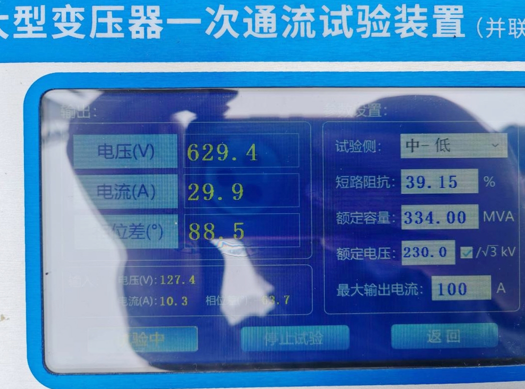 變電站主變保護(hù)裝置安裝調(diào)試完成,試驗前所有準(zhǔn)備工作經(jīng)現(xiàn)場確認(rèn),試驗現(xiàn)場負(fù)責(zé)人傳出指令: 開始主變通流試驗,根據(jù)試驗方案選取注流點,將電流升到45A通變壓器中壓側(cè)到高壓側(cè)相關(guān)間隔,安全和防誤措施、技術(shù)和試驗步驟實行試驗單位和檢修負(fù)責(zé)人雙確認(rèn)。 在總指揮的統(tǒng)籌指導(dǎo)下,各方通力合作,設(shè)備滿足方案要求,中壓側(cè)對高壓側(cè)試驗時,通變壓器輸出45A電流、380V電壓,確認(rèn)變壓器差流與角度正確,所有間隔試驗半小時內(nèi)全部完成。