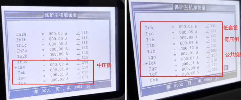 本次使用HTB-8000 大型變壓器一次通流試驗(yàn)裝置對500kV主變差動保護(hù)進(jìn)行向量檢查,從一次側(cè)升壓,利用變壓器本身短路阻抗實(shí)現(xiàn)穿越通流,一次性實(shí)現(xiàn)對主變高(中)壓側(cè)外附CT、套管CT、公共繞組CT以及低壓側(cè)外附CT、套管CT通流,驗(yàn)證主變縱差保護(hù)、分相差動保護(hù)、分側(cè)差動保護(hù)以及低壓側(cè)小區(qū)差動保護(hù)向量正確性,通過差流大小即可判斷主變保護(hù)向量極性是否正確,大大提高送電效率。