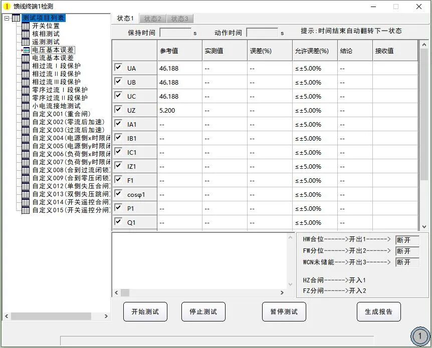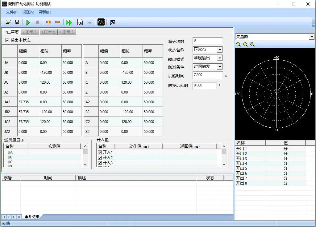 打開配網(wǎng)自動(dòng)化測(cè)試系統(tǒng),點(diǎn)擊主界面“功能測(cè)試”,配置測(cè)試項(xiàng)目的狀態(tài)序列,并命名保存。