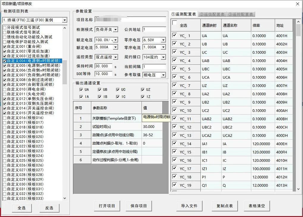 打開“項(xiàng)目管理”配置測(cè)試案例、FTU或DTU基本參數(shù)、額定電壓、額定電流、零序電壓、零序電流、保持時(shí)間、SOE等待時(shí)間、遙測(cè)、遙信點(diǎn)表。