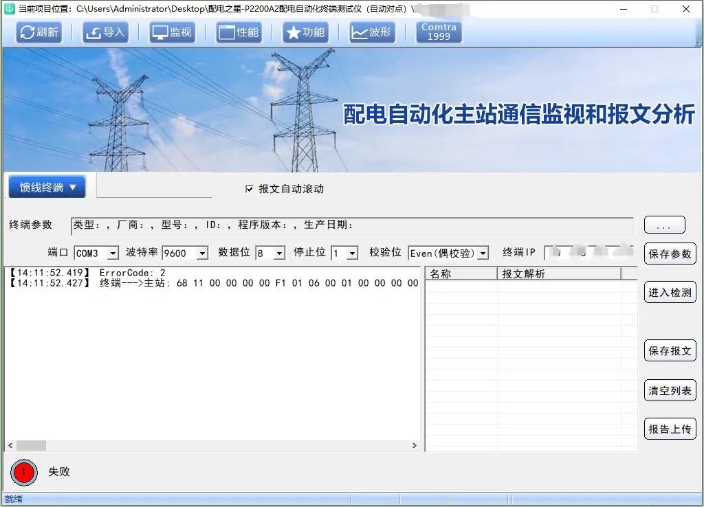 測(cè)試項(xiàng)目配置完成后,返回主界面點(diǎn)擊配網(wǎng)測(cè)試,導(dǎo)入配置的測(cè)試案例,填寫通訊模塊與測(cè)試儀相連接的串口、波特率、數(shù)據(jù)位、停止位、校驗(yàn)位、終端SIM卡IP,填寫完畢后點(diǎn)擊保存與刷新。當(dāng)收到主站回復(fù)時(shí),黃色與綠色提示燈交替閃爍,表示與主站通訊已建立,可進(jìn)行自動(dòng)對(duì)點(diǎn)測(cè)試。
