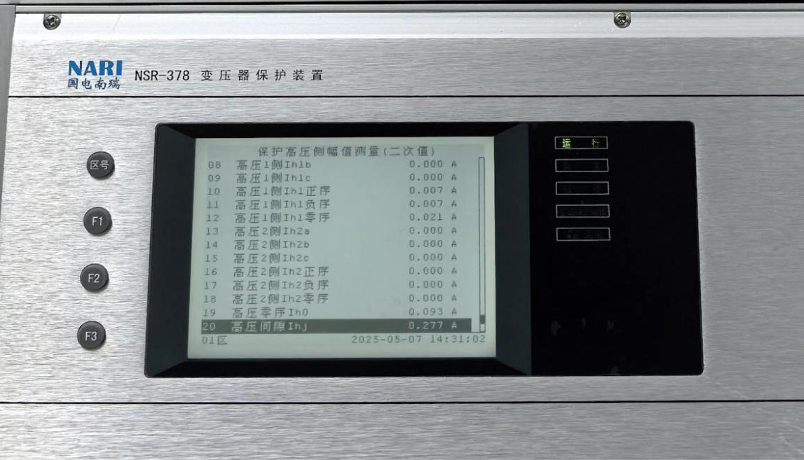 高壓側(cè)線路和主變間隔電流互感器變比為 1250/1 ,間隙為 100/1 ,因過(guò)感性負(fù)載滯后角度 90 °,在一次側(cè)電流相較于電壓的相角是 -90 °,線路保護(hù)裝置因?yàn)橐淮蝹?cè)的電流互感器 P1 指向 220kV 母線,裝置施加電流是從 P2 流向母線,故此線路保護(hù)裝置顯示的電壓是正序,角度是 0.22A ∠ 90 °正序。